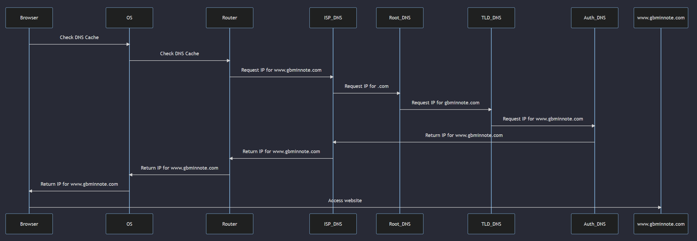 www.gbminnote.com도메인을 PC 브라우저에 입력하면 DNS 라우팅 과정은 다음과 같다.