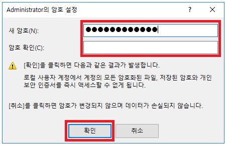 Local Users and Groups 메뉴에서 암호변경 - 새 비밀번호 입력: 지시에 따라 새 비밀번호를 입력하여 비밀번호를 변경한 후 확인.