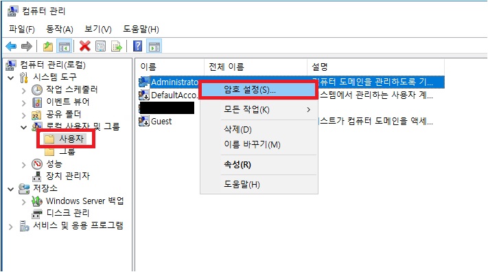 - 암호 설정: 'Administrator' 계정을 마우스 오른쪽 버튼으로 클릭하고 'Set Password' 또는 'Change Password' 옵션을 선택한다. (한국어 버전 은 캡처화면 메뉴를 참고)
