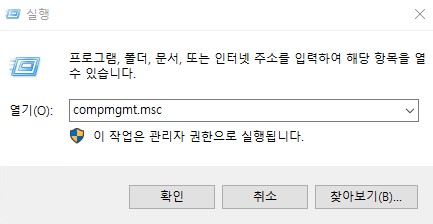 - Computer Management 열기: Windows 키 + R을 눌러 '실행' 창을 열고 compmgmt.msc 를 입력하여 실행한다.