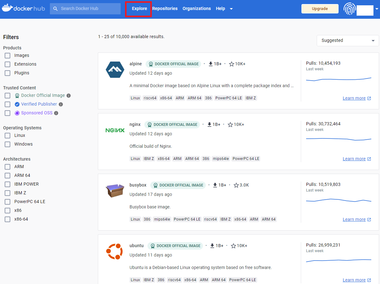 Explore 메뉴 접속 하면 수천 개 이미지가 존재함.