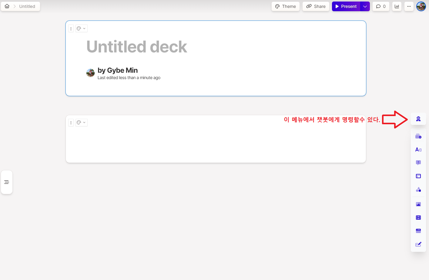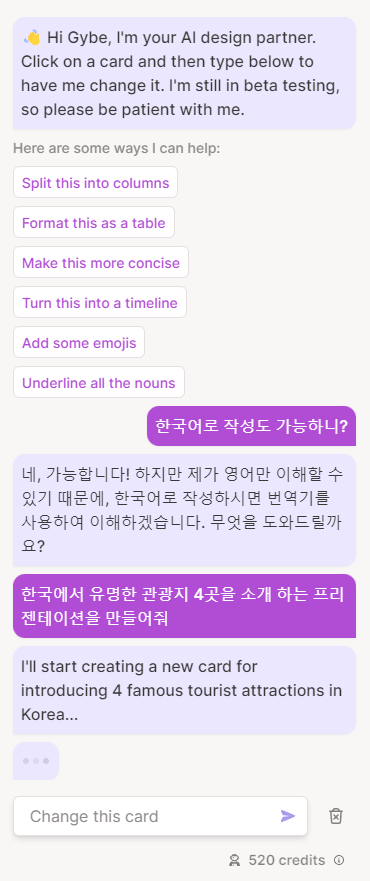 Gamma App 은 가입 후 무료로 사용이 가능하다 첫 가입 시 600 credits이 제공되는데 1 토큰을 생성할 때마다 10 credits이 차감되는 구조다. 아직 유료플랜은 없지만 곧 제공될 예정이다. 프레젠테이션 생성 방법은 챗봇에게 원하는 내용이나 스타일을 만들어달라고 요청하면 된다. 테스트해 보니 한글도 지원하고 있었다.