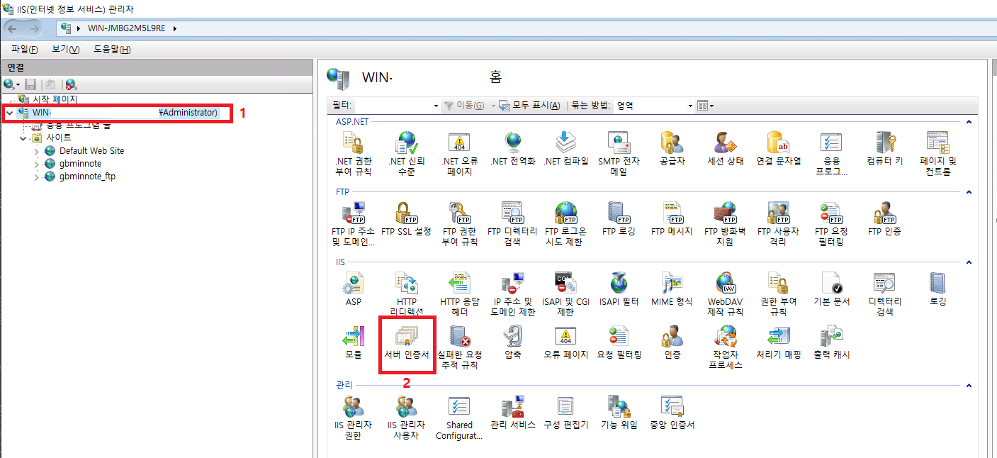 - IIS 관리자 실행 → 서버선택 → 서버인증서 등록
