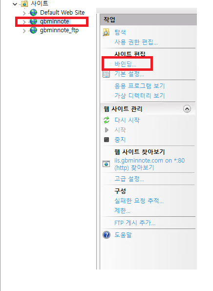 - 웹사이트 리스트에 설치할 사이트 이름선택 → 작업 탭 에서 바인딩 클릭