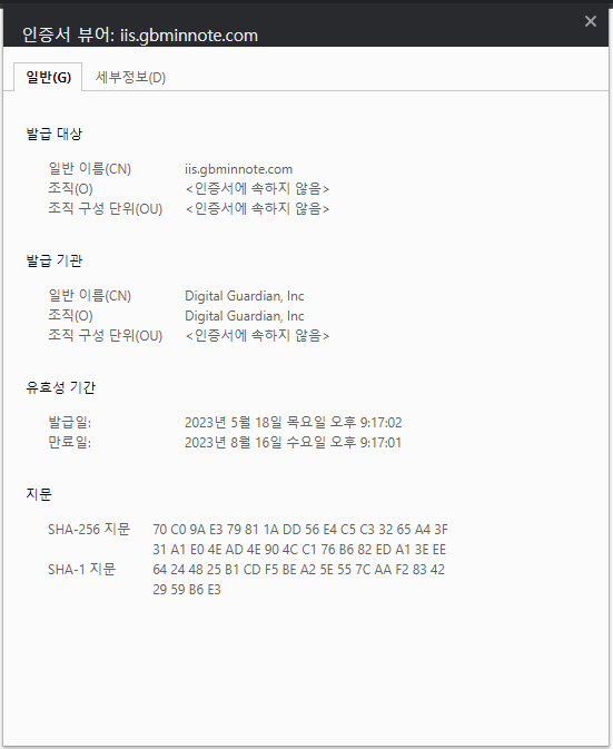- 인증서 정보 확인.인증서 등록이 완료되었다면 웹사이트에 https:// 로 접속하여 자물쇠 모양을 클릭해서 인증서 정보를 확인해본다.