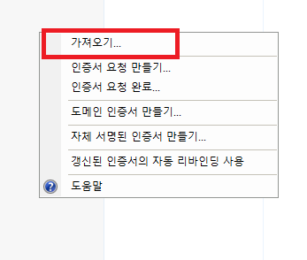 - IIS 관리자 실행 → 서버선택 → 서버인증서 등록