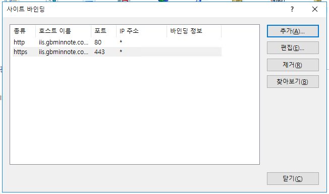- 사이트 바인딩 → 추가 → 추가할 바인딩 정보를 입력