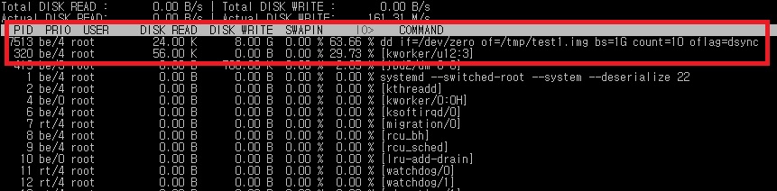 stress test를 진행하고 iotop으로 모니터링 하였다.