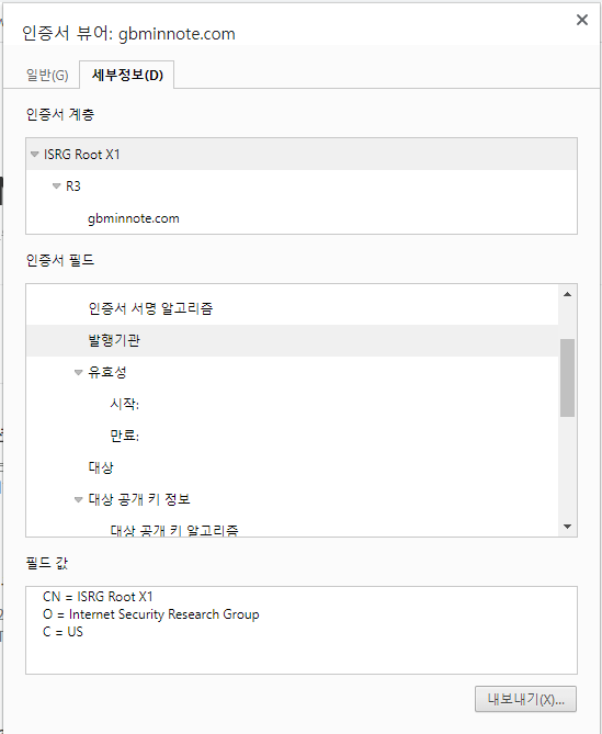 세부 정보 탭에서는 인증서의 암호화 기술과 관련정보들을 좀 더 자세히 볼 수 있다. 인증서 종류에 따라 표기되는 항목이 다르게 보일 수 있다.