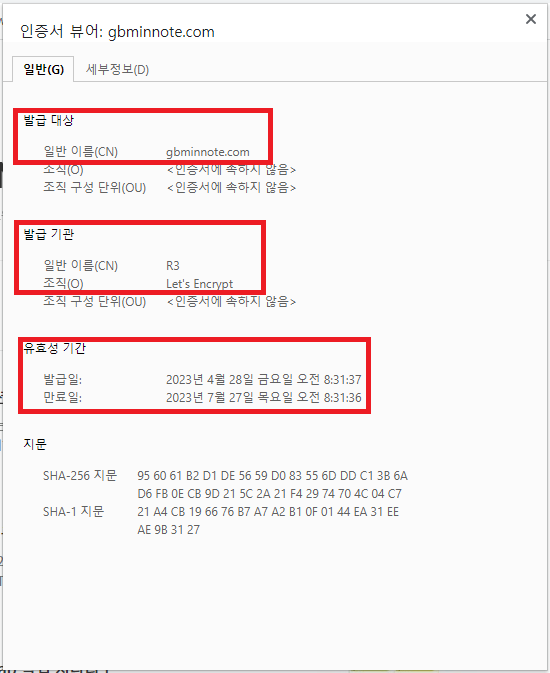 인증서정보에는 여러 가지 정보들이 포함되는데 대표적으로 발급 기관의 정보, 웹 사이트 정보(도메인, 회사명), 공개키(암호화 및 복호화에 사용) 정보들이 포함된다. 일반 정보 탭에서는 발급도메인, 발급 기관, 인증서유효기간을 볼 수 있다. 인증서 유효기간이 지나면 사이트 접속 시 신뢰할 수 없는 인증서라는 에러가 발생되고 사이트 접속이 안되기 때문에 만료일 전에 인증서 관리를 잘해야 한다. 참고로 인증서 발급은 13개월 이상 발급받을 수 없기 때문에 만료일 1개월 전쯤 새로운 인증서를 발급받아 관리를 해주는 게 중요하다.