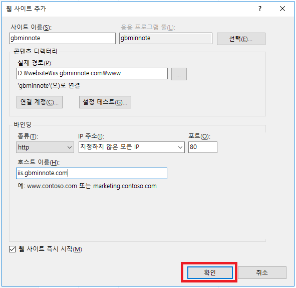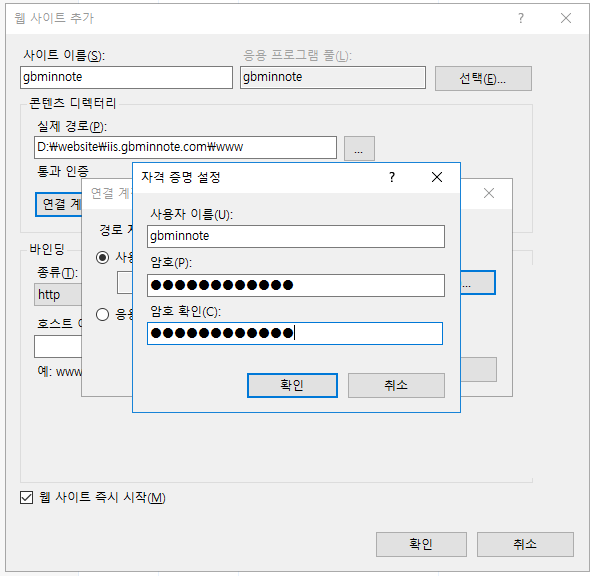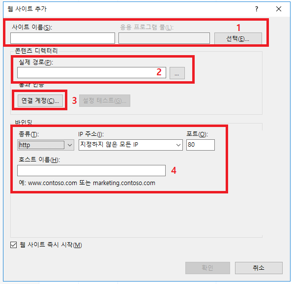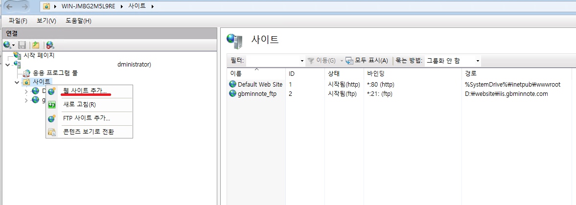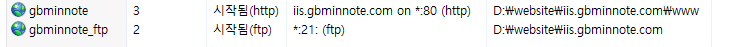 - 서버관리 → 도구 → IIS(인터넷 정보 서비스) 관리자 → 사이트 → 웹사이트 추가