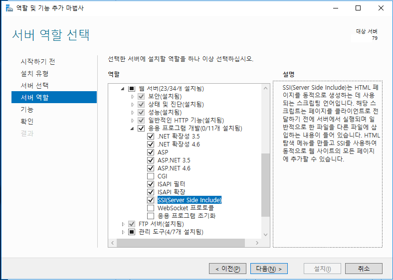 - 서버관리자 → 관리 → 역할 및 기능 추가 필요한 항목을 설치한다.