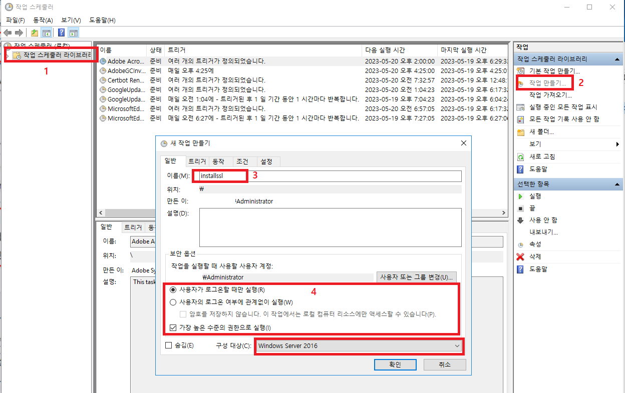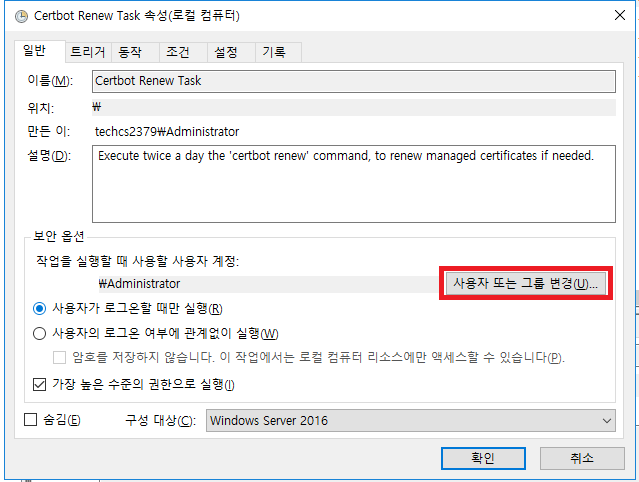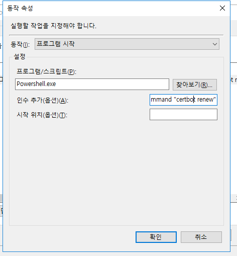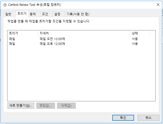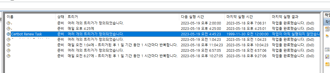 윈도우 버전의 certbot 은 설치 시 스케쥴러에 자동 갱신 스케줄러가 등록되기 때문에 설정내용을 확인 후 원하는 관리 방식으로 변경해서 실행해 주면 된다.