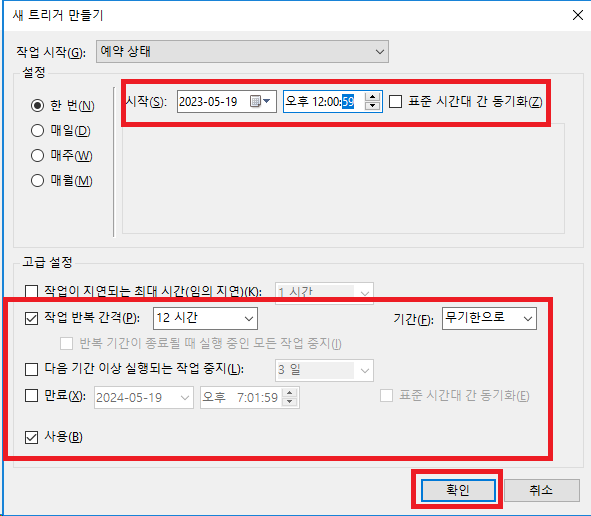 스케줄러가 정상동작 안 한다면 작업 계정 설정을 재설정해주면 된다.