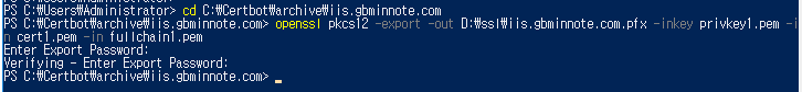 PS C:\Certbot\archive\iis.gbminnote.com> openssl pkcs12 -export -out D:\ssl\iis.gbminnote.com.pfx -inkey privkey1.pem -i