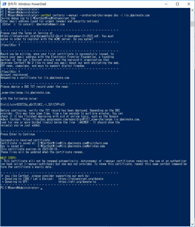 certbot certonly --manual --preferred-challenges dns -d iis.gbminnote.com